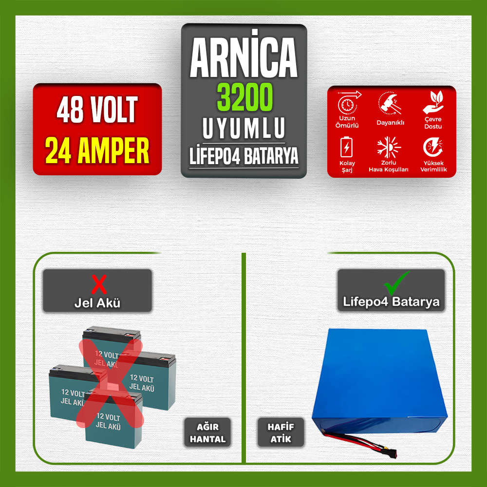 Arnica 3200 elektrikli motosiklet için tasarlanan 48 Volt 24 Amper LiFePO4 batarya, yüksek verimli ve dayanıklı yapısıyla öne çıkan bir güç kaynağıdır. Elektrikli araçlarda üstün performans sağlayan bu batarya, güvenli ve uzun ömürlü bir enerji depolama çözümü sunar. Modern LiFePO4 teknolojisiyle üretilen bu batarya, güvenlik, enerji yoğunluğu ve kullanım ömrü gibi alanlarda benzersiz avantajlar sunar.