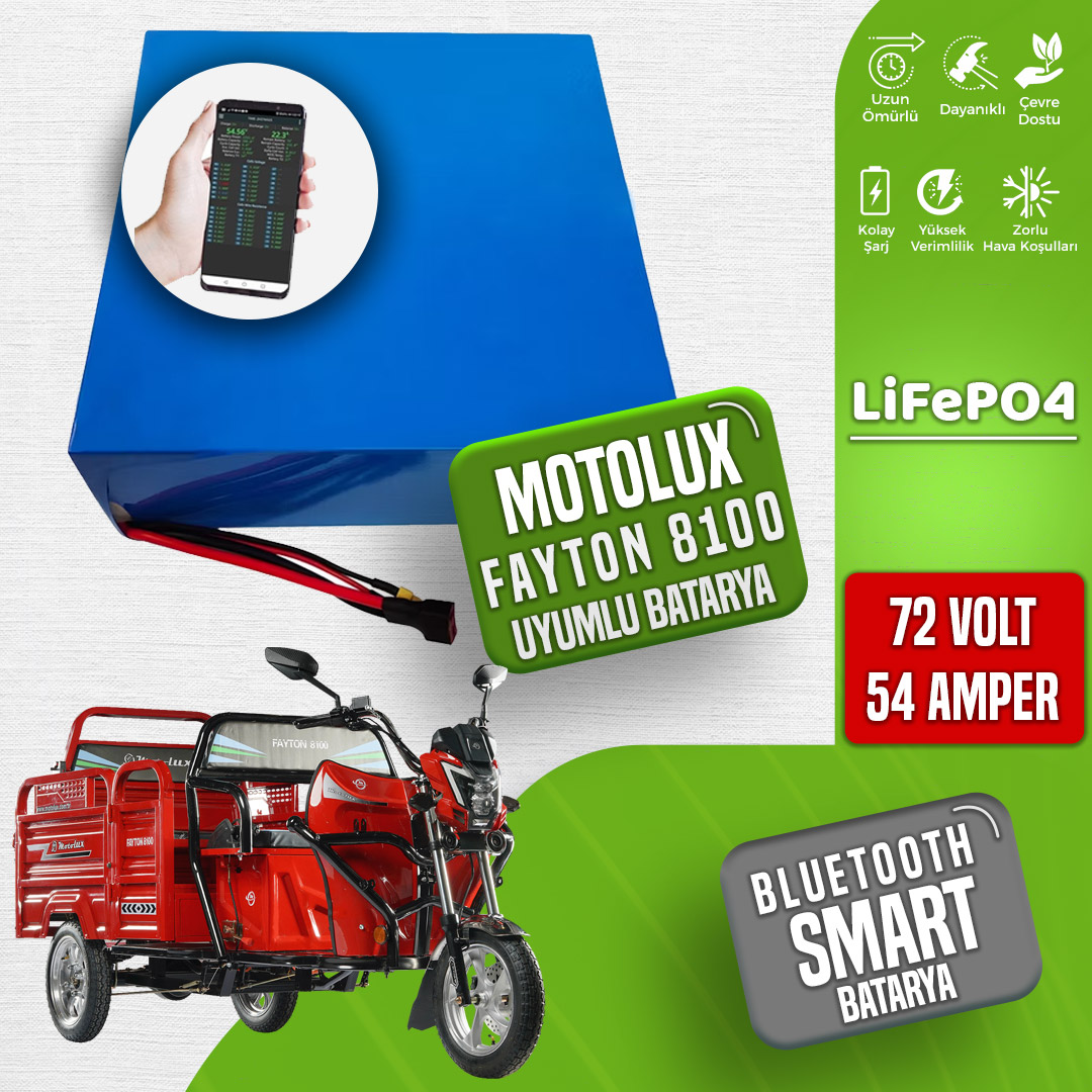 Motolux Fayton 8100 elektrikli moped için tasarlanan 72 Volt 54 Amper SMART (AKILLI) BLUETOOTH ÖZELLİKLİ LiFePO4 batarya, yüksek verimli ve dayanıklı yapısıyla öne çıkan bir güç kaynağıdır. Elektrikli araçlarda üstün performans sağlayan bu batarya, güvenli ve uzun ömürlü bir enerji depolama çözümü sunar. Modern LiFePO4 teknolojisiyle üretilen bu batarya, güvenlik, enerji yoğunluğu ve kullanım ömrü gibi alanlarda benzersiz avantajlar sunar.