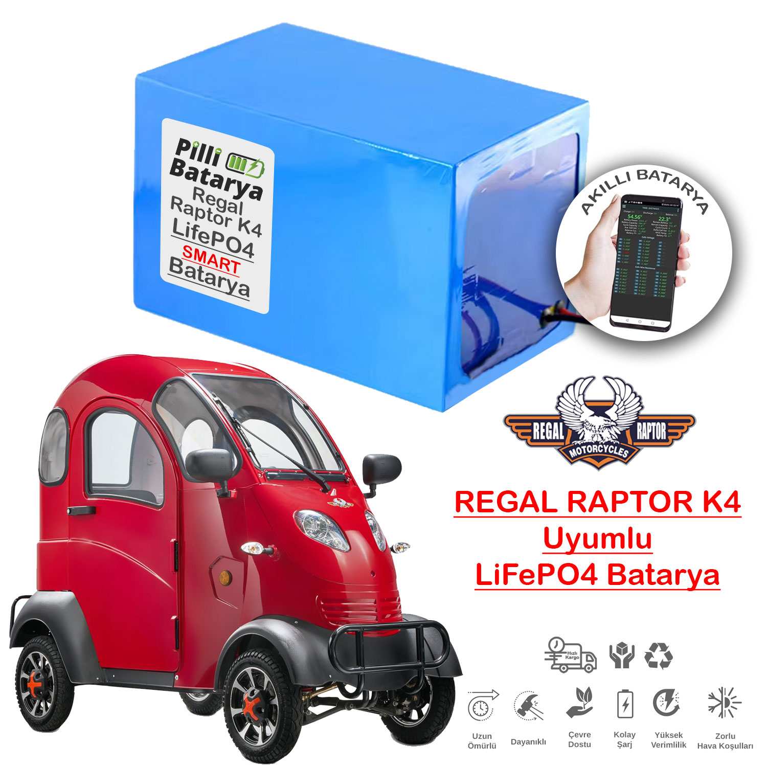 Regal Raptor K4 elektrikli araçta kullanılan LiFePO4 Smart Batarya, performansı optimize eden akıllı bir batarya yönetim sistemi (BMS) ile entegre edilmiştir. Bu sistem, bataryanın sıcaklık ve voltaj değerlerini izleyerek, kullanım ömrünü uzatır ve güvenliği en üst düzeye çıkarır.