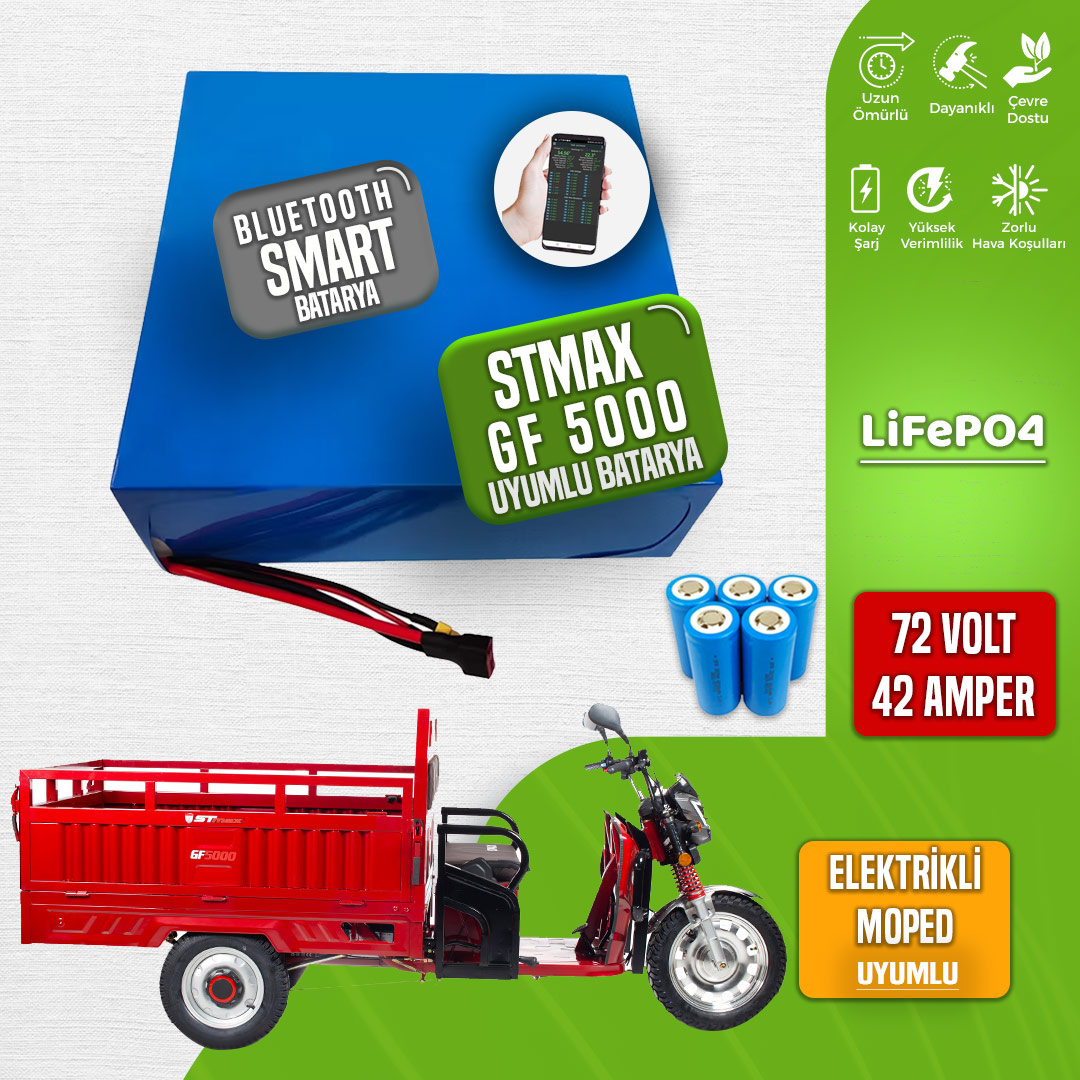 Stmax Gf 5000 elektrikli moped için tasarlanan 72 Volt 42 Amper LiFePO4 Smart Batarya, yüksek verimli ve dayanıklı yapısıyla öne çıkan bir güç kaynağıdır. Elektrikli araçlarda üstün performans sağlayan bu batarya, güvenli ve uzun ömürlü bir enerji depolama çözümü sunar. Modern LiFePO4 teknolojisiyle üretilen bu batarya, güvenlik, enerji yoğunluğu ve kullanım ömrü gibi alanlarda benzersiz avantajlar sunar.