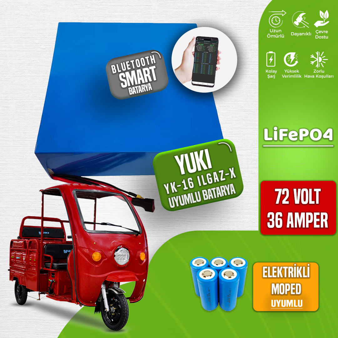 YK-16 ILGAZ-X elektrikli moped için tasarlanan 72 Volt 36 Amper LiFePO4 Smart Batarya, yüksek verimli ve dayanıklı yapısıyla öne çıkan bir güç kaynağıdır. Elektrikli araçlarda üstün performans sağlayan bu batarya, güvenli ve uzun ömürlü bir enerji depolama çözümü sunar. Modern LiFePO4 teknolojisiyle üretilen bu batarya, güvenlik, enerji yoğunluğu ve kullanım ömrü gibi alanlarda benzersiz avantajlar sunar.