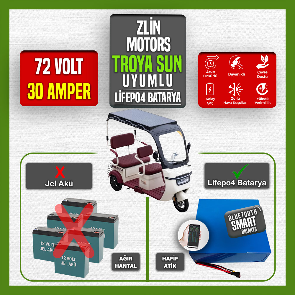 Zlin Troya Sun elektrikli moped için tasarlanan 72 Volt 30 Amper LiFePO4 Smart Batarya, yüksek verimli ve dayanıklı yapısıyla öne çıkan bir güç kaynağıdır. Elektrikli araçlarda üstün performans sağlayan bu batarya, güvenli ve uzun ömürlü bir enerji depolama çözümü sunar. Modern LiFePO4 teknolojisiyle üretilen bu batarya, güvenlik, enerji yoğunluğu ve kullanım ömrü gibi alanlarda benzersiz avantajlar sunar.